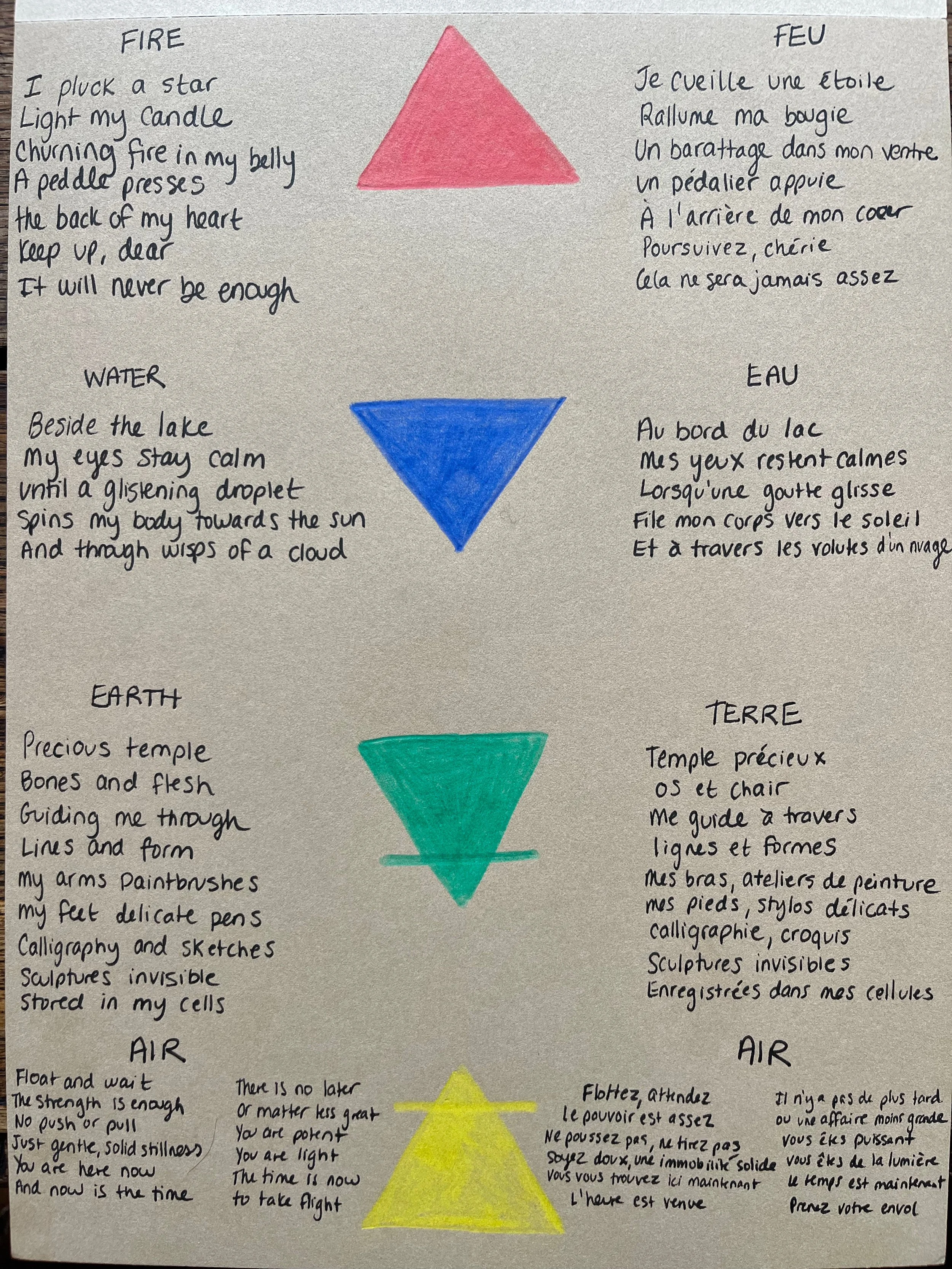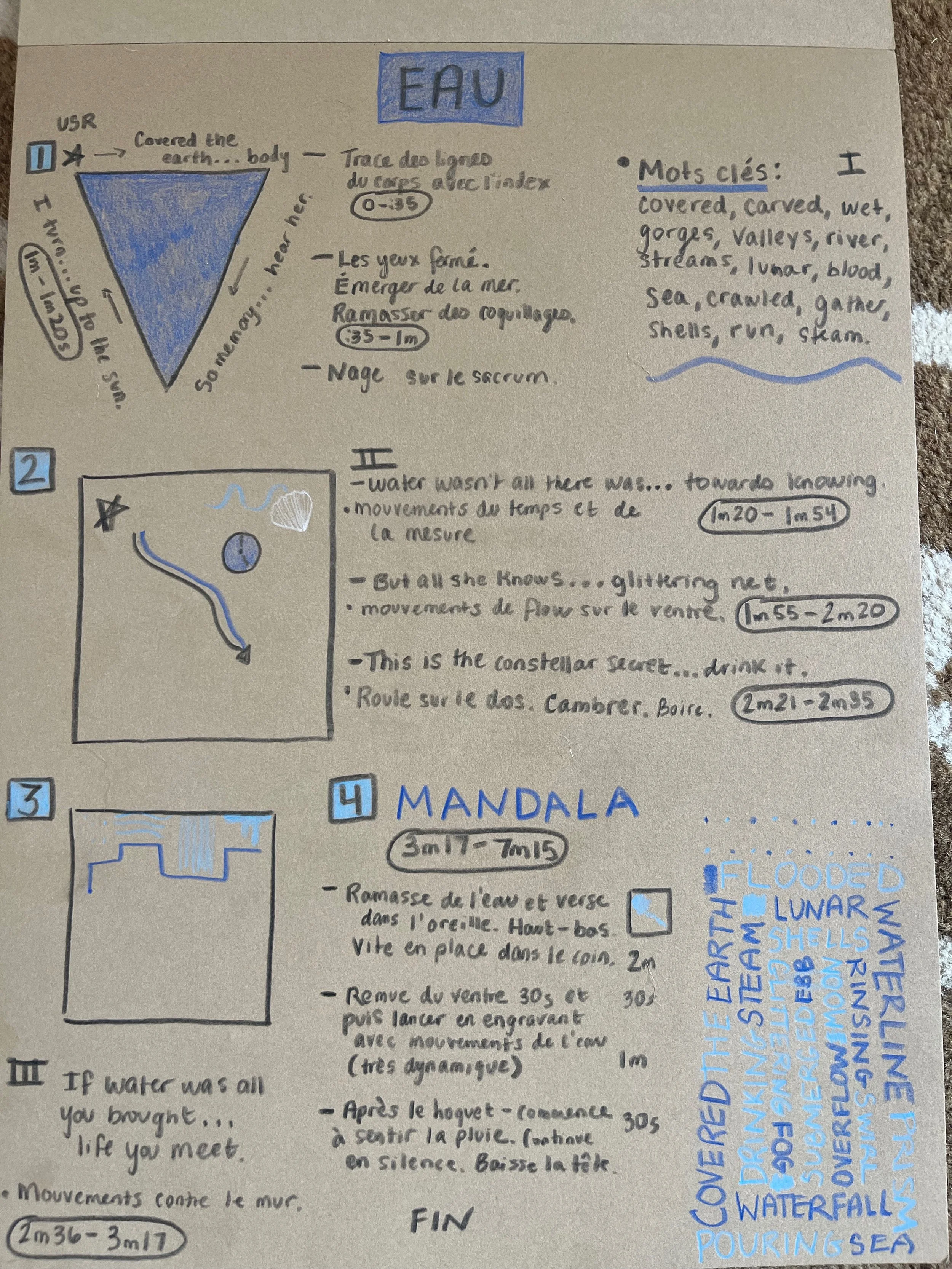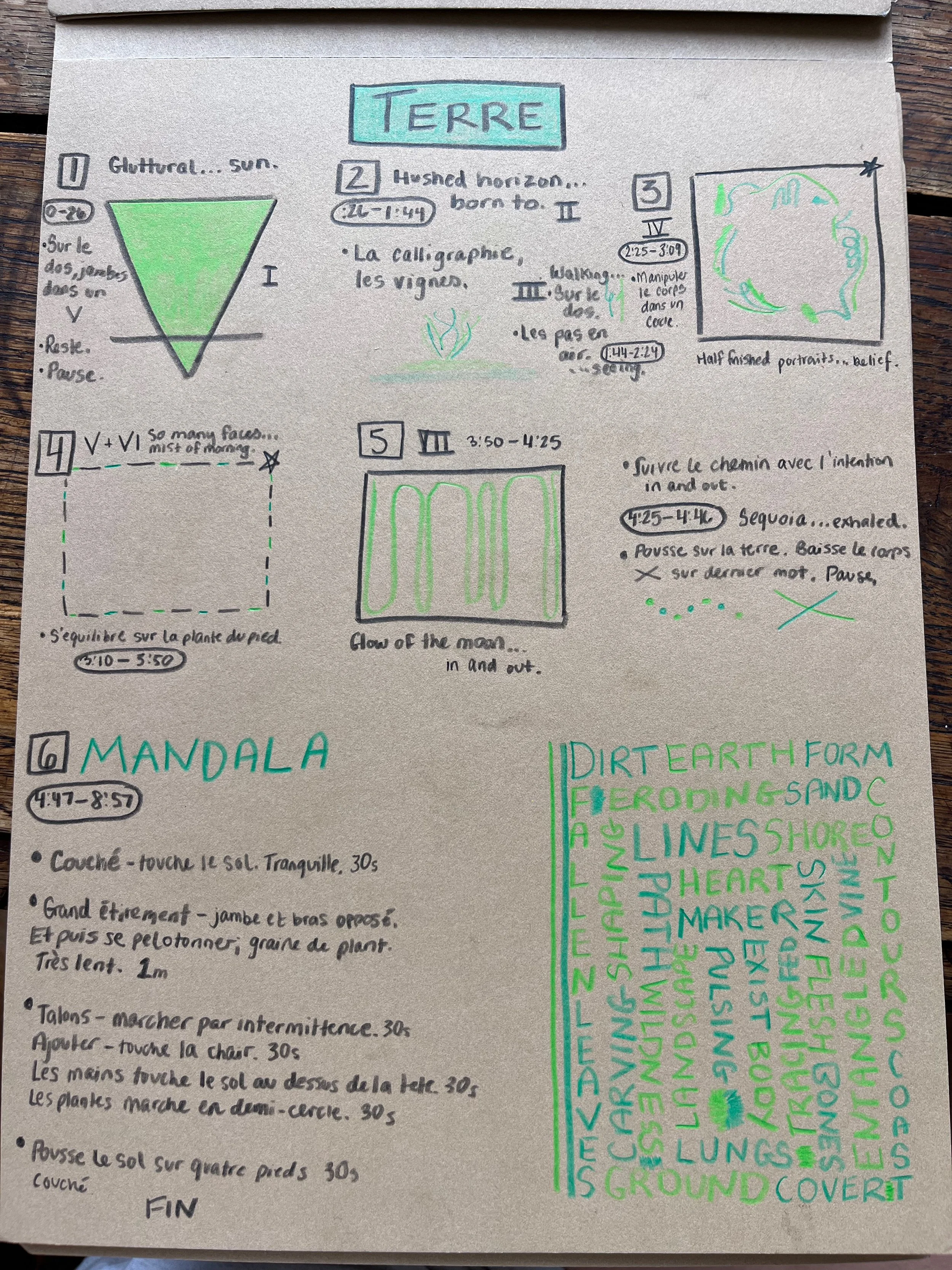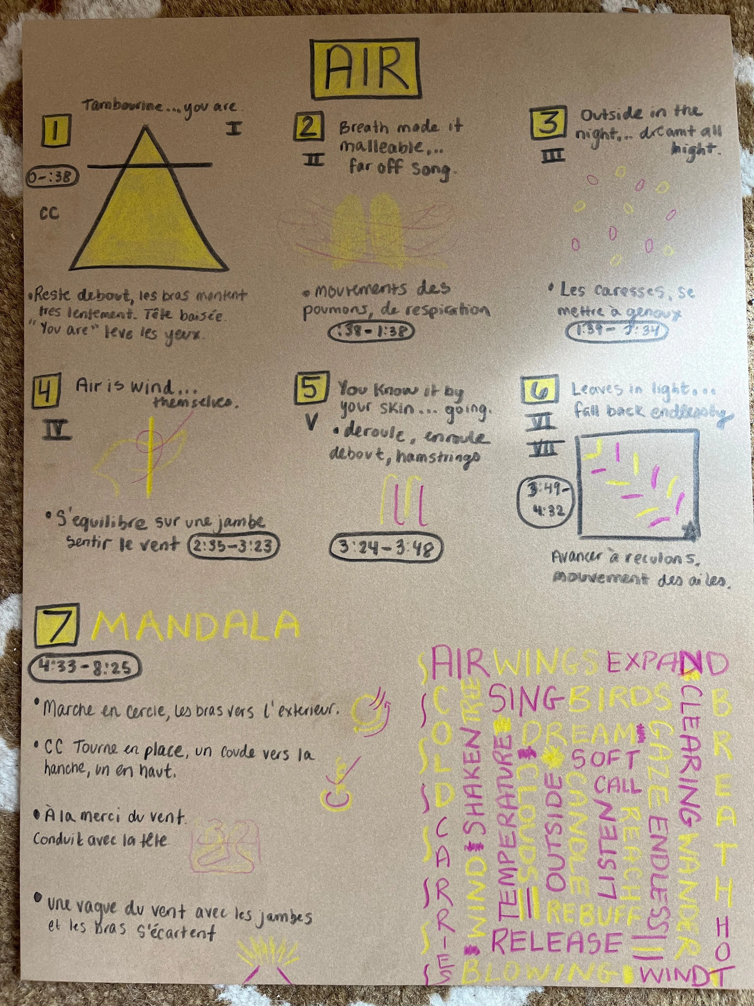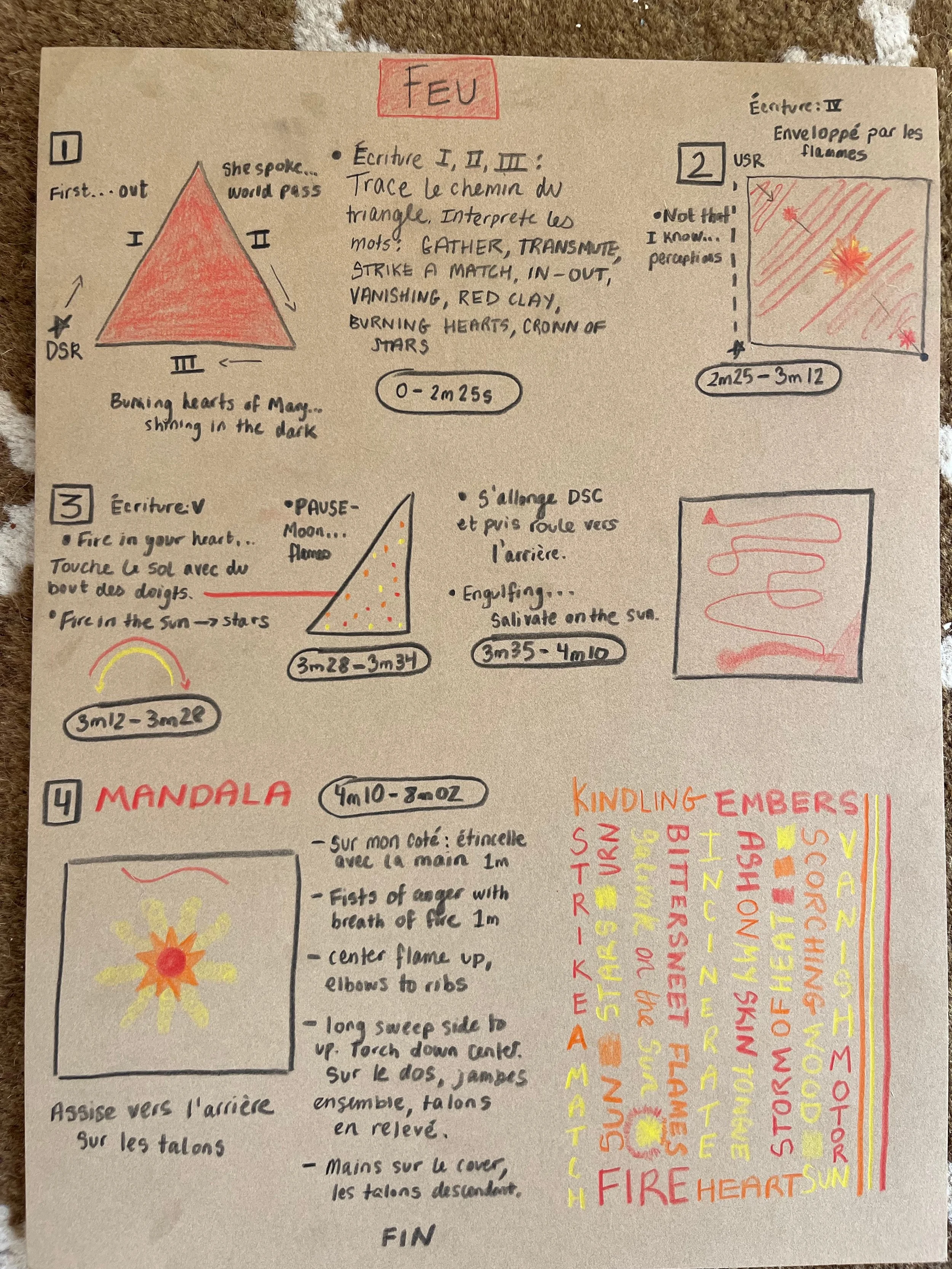Over this magical two week period at Chateau Orquevaux, I explored the four elements of matter: Earth, Water, Fire, and Air. I would begin by building an altar with various items pertaining to the element I was working with that day. I played with Koshi chimes for sound, which are already created to correspond with the elements. I followed my curiosity and moved to writing inspired by the elements by Elizabeth Snowden. As I created in communication with her words, I mapped out my movement through space via drawings made with watercolor pencils. Some poetry was also produced during this process. The movement art works were filmed at the end of this two week period and are very much still works in progress.